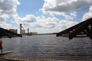 После поворота налево, надо будет по деревянному настилу с перилами, похожему на длинный мост, пройти пешком. Путь составит примерно 2 или 2,5 км (обойти нужно заводскую территорию).