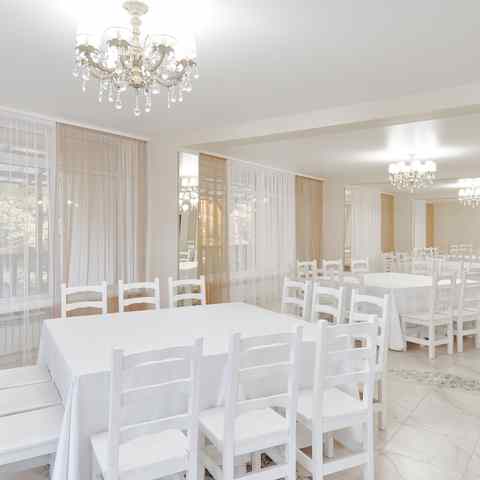 - Двухэтажное кафе — здесь красивый классический интерьер, в банкетном зале можно комфортно рассадить до 200 человек.