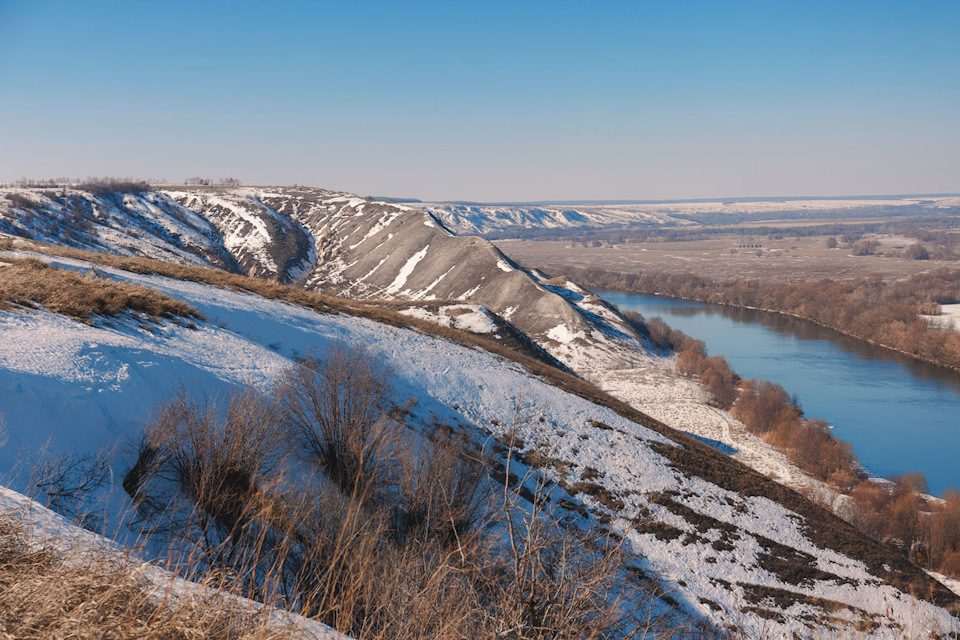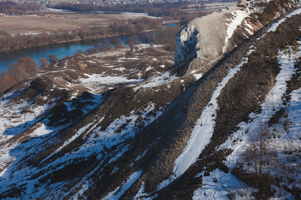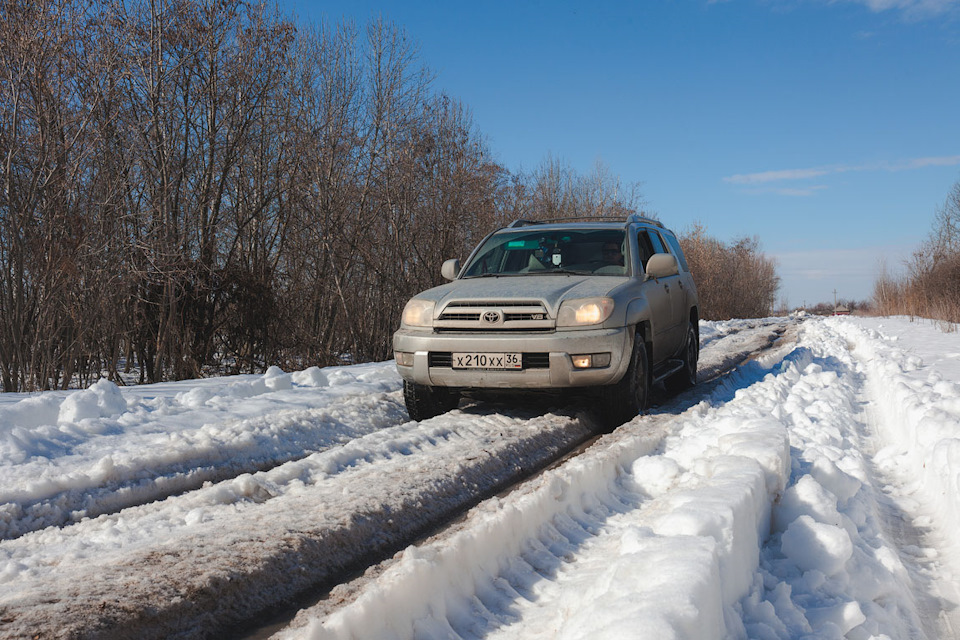 В марте здесь так же очень живописно, стояла чудесная погода и мы отправились в это любимое место. Село расположено на правом берегу Дона в 38 километрах к северу от Острогожска и 52 км на юг от Воронежа. Ехать нужно по Острогожской трассе — она намного спокойнее и свободней М4, ехать по ней — одно удовольствие. Доезжаем до поворота на Сторожевое и по пустынной дороге еще 8 км до села. Проезжаем село насквозь до упора и поворачиваем на грунтовую дорогу, ведущую к меловым скалам. Снега за городом еще достаточно, но он активно тает, поэтому дорога превратилась в жидкую кашу. Но машинка позволяет, поэтому пробираемся как можно дальше к высоким меловым склонам реки Дон.