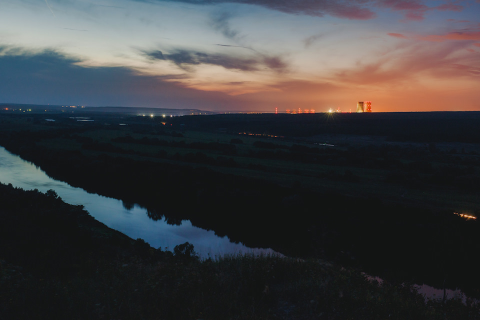 Вокруг тишина, многие туристы приехавшие на денек давно разъехались, ну а мы остаемся на ночлег. Солнце совсем скрылось, наступили сумерки. Атомная электростанция будто подсвечивает ночное небо своим электрическим сиянием, гармонично вписавшись в пейзаж.