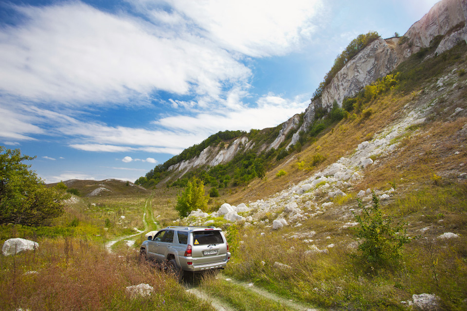 Мы конечно и внизу у подножия склонов побывали — очень осторожно спустились по достаточно крутой дороге, включив блокировки на машине. Посмотрите, разве не красота? Меловые глыбы осыпаются по склонам, горы возвышаются над нами, мне действительно показалось, что мы в Крыму! Похожие пейзажи, только гораздо масштабнее — мы наблюдали в районе городка Белогорск рядом с величественной скалой из известняка Ак-Кая.
