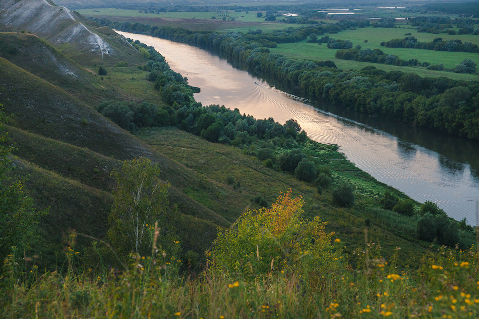 Могучий тихий Дон степенно течет внизу у подножия достаточно высоких склонов высотой около 30м. Мы называем их меловыми горами. На противоположной стороне реки абсолютно ровные заливные луга со свежей зеленой травой. Вдали раскинулось село Аношкино. Повезло же жителям — живут в такой красоте с такими видами рядом с рекой.