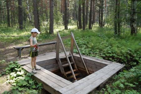 Стоянка «Таюткино зеркальце». Сюда надо подняться по деревянной лестнице. Здесь, на возвышении, находятся большой деревянный стол и скамейки, место для разведения костра. Сам объект представляет собой макет шахты, вход в старый рудник – деревянный сруб в горе, а зеркало – металлический лист, дарящий посетителю собственное отражение.