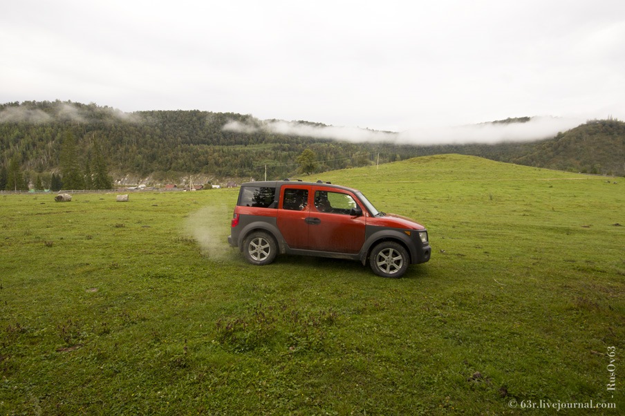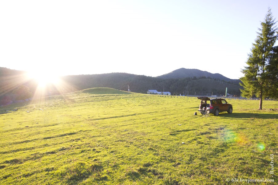Взяв чистые вещи, мы ушли отмываться в горячей воде и выпаривать в бане усталость. Замочили, отпарили грязные тельца, ноги отмыли от походной пыли, отдохнули, и вышли совершенно свежими, не чувствуя после пяти дней похода ничего, кроме приятного избытка впечатлений. В деревне все тихо и не торопливо – одни пасут, другие пасутся, пекут хлеб, доят коров Сходили в местный магазин, купили необходимые продукты. Вечерело, решили на ночь остаться в деревне и переночевать в машине на холме, где располагалась школа, для того чтобы наконец-то поснимать звездные треки. Приготовили ужин и с огромным аппетитом его умяли. Погода наладилась – было приятное вечернее солнце и ни облачка на небе!