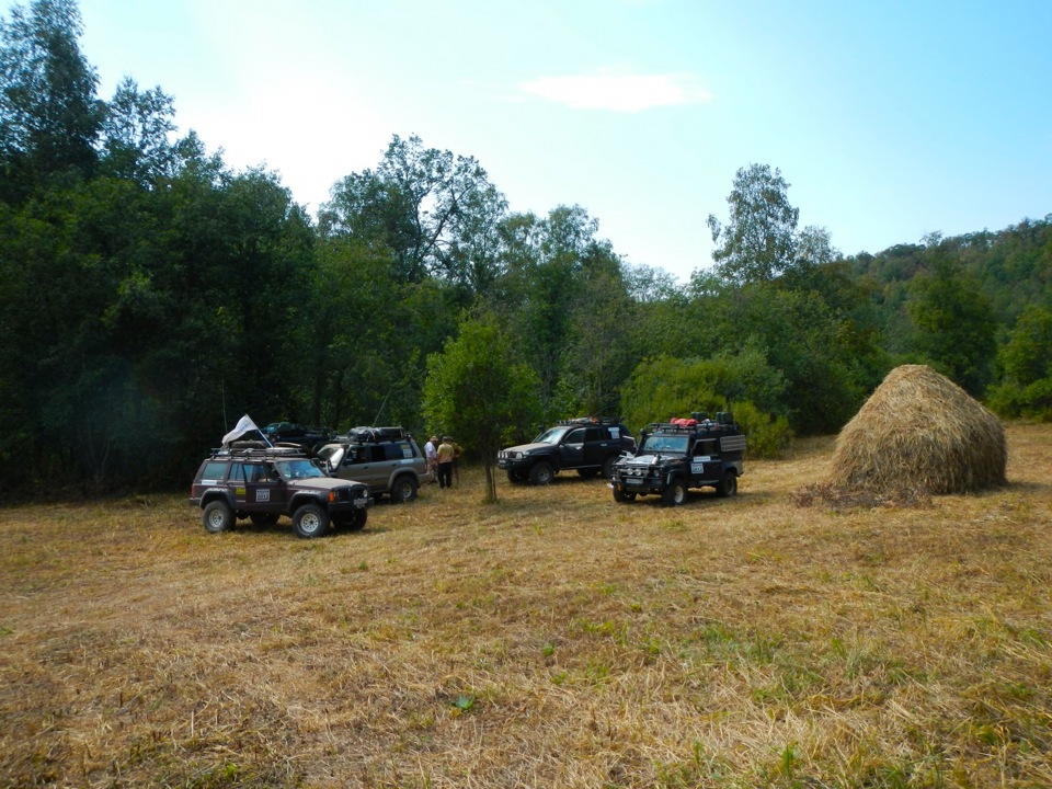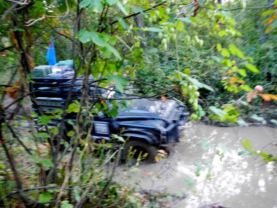 Тем временем, пропетляв по лесу около 2-х часов тропа (а вместе с ней и генштаб с озиком), после пары крутых подъемов вывели нас на большую поляну. По сути это был холм с плоской вершиной, заросшей по периметру густым подлеском. В который тропа с одного склона и уходила. Мы отправили одну машину на разведку, а сами встали на перекур на поляне. Приехавший спустя 15 мин разведчик (Коля на чирке) сообщил, что с поляны, выезда пригодного для прохода внедорожников нет. А по карте тропа спускалась под уклон под уклон почти под 45 градусов, была полностью заросшей подлеском, да и вдобавок со значительным боковым креном. Самое главное – не было никаких следов спуска по ней на любой колесной или гусеничной технике.