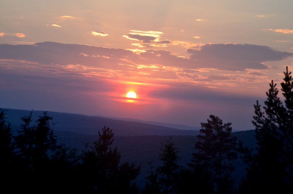 Проплыли мы в общей сложности около 15 километров. По времени сплав занял 3,5 часа. Из Толпарово мы выехали в 20.30. Закат встретили в горах.