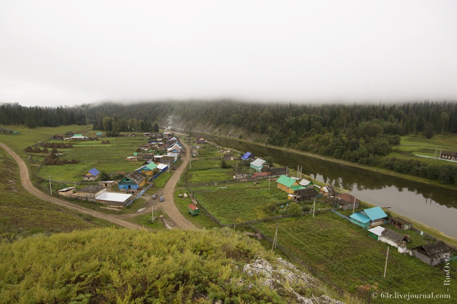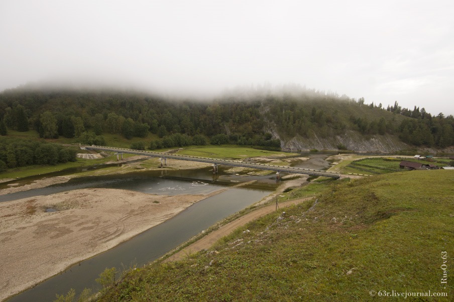 Раннее утро, туман все такой же плотный и густой, окутывает весь противоположный берег Зилима и мееедленно поднимается вверх. Деревня с высоты холма.