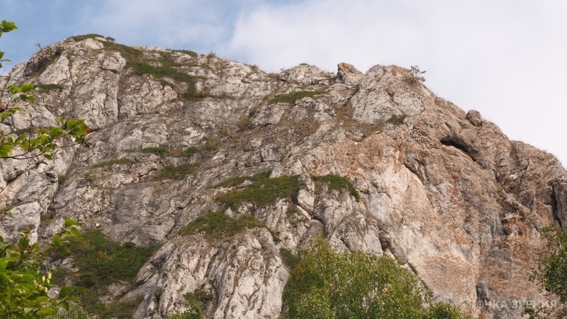Вдали виден Голубиный грот и утес, с правой стороны которого находится Старомурадымовская пещера. На фото он слева. Грот отсюда практически не заметен.
