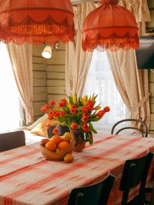 Изба с виду кажется небольшой, но внутри довольно просторная. Она рассчитана на десять человек — по числу спальных мест. В четырех отдельных комнатах стоят по две высокие кровати, еще две — в гостиной. Хлопковое постельное белье и узорчатые покрывала на них дополняют дизайн дома, а расположенная рядом печь приятно греет. В интерьер лаконично вписываются старинный комод, в котором женщины, по традиции, хранили приданое, антикварное зеркало почти в полный рост, сервант с аккуратно выполненным сервизом и изящный столик на высоких ножках — на него можно поставить вазу с еловыми веточками зимой или цветами в теплое время года. Здесь же, в общей комнате, находится большой стол, покрытый плотной скатертью. За ним удобно не только обедать, но и расположиться с настольными играми — их привозите с собой. Пол в гостиной устлан стилизованными под старину половиками, окна украшают шторы с подхватом, а под потолком — абажуры из красной ткани, приглушающие свет.
