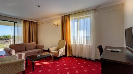 - 1 king suite (макс. 2 чел., 100 кв.м, спальная комната с межкомнатной дверью, гостиная, имеется оборудованный рабочий стол, ванная комната с ванной, душем и джакузи, отдельный туалет).
