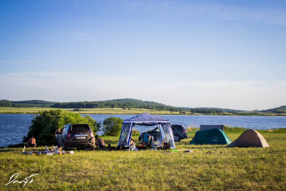Территория рядом с озерами условно разделена на несколько зон. Главная дорога уводит вглубь небольшого леса в палаточный лагерь. Рядом шумно течет Снежная, близость реки удачна для тех, кто останавливается здесь на несколько дней. К деревьям прибито несколько урн.