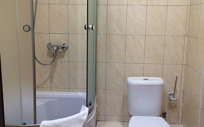 В санузле туалет и душевая кабина. А также туалетные принадлежности, полотенца, тапочки.