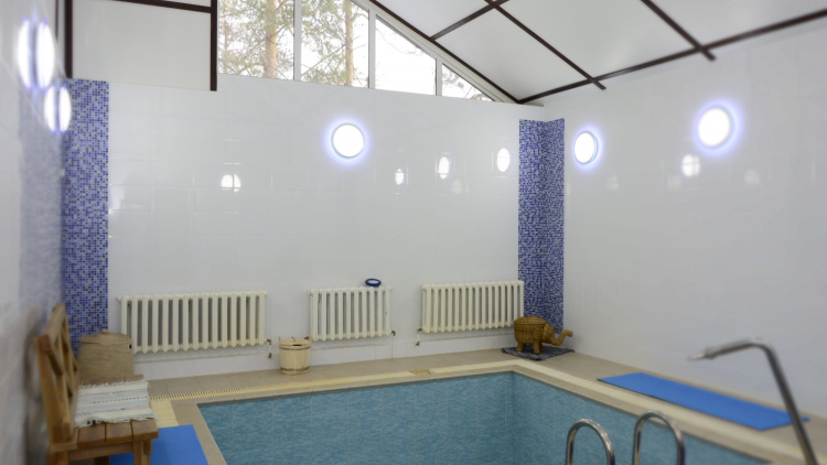 Банный комплекс. На территории загородного клуба расположен роскошный банный комплекс площадью 100 кв м с минеральным бассейном, просторной комнатой отдыха, полностью оборудованной кухней и просторным патио с площадкой для барбекю.