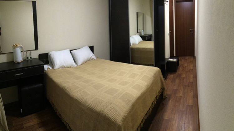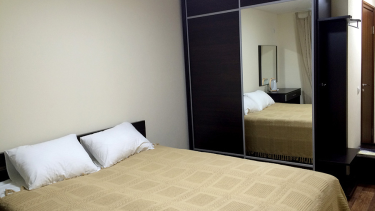 Уютный и светлый номер, рассчитанный на размещение двух человек. Номер оборудован двуспальной кроватью и всей необходимой мебелью.