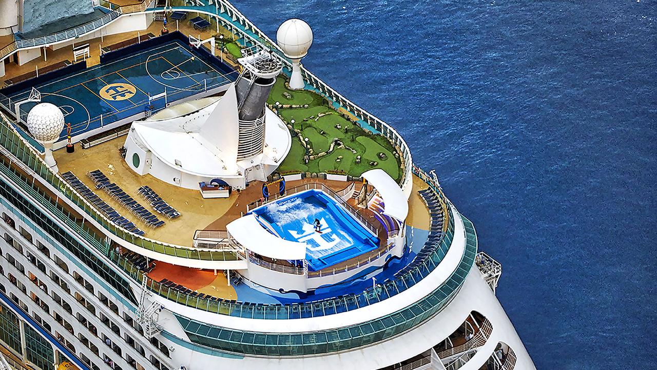 4. Верхняя палуба новейшего лайнера Harmony of the Seas (компания Royal Caribbean Int.) с симулятором серфинга, полем для мини-гольфа и грандиозной водяной горкой Ultimate Abyss