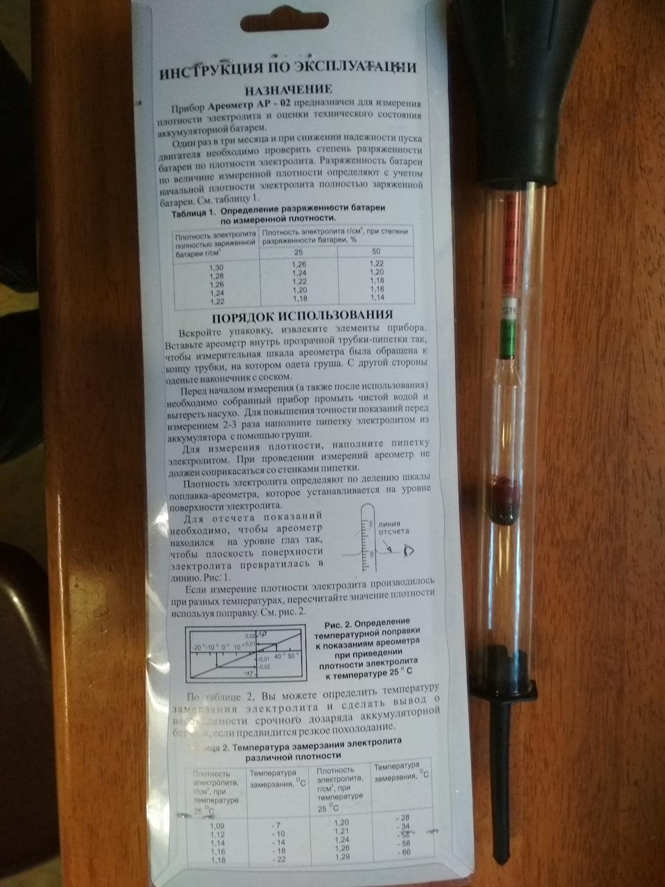 5. Эмпирическим методом выяснил, что ареометр брешет на 2-2.5 десятых деления. Брал у соседа ареометр сравнить. У него внутри даже бирка с ГОСТом. Понял, что не так всё плачевно и аккумулятор должен пережить зиму)