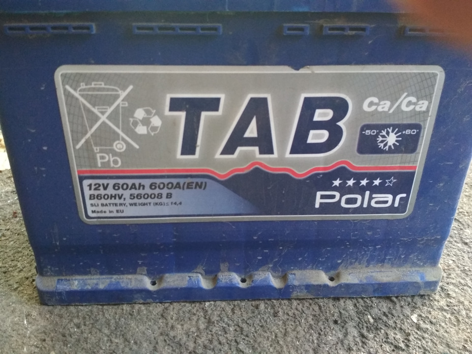 аккумулятор TAB POLAR 60Ah довольно новый, около года, зарядка на машине нормальная (замерял напряжение — 14,2 В), индикатор горел всегда зелёный.