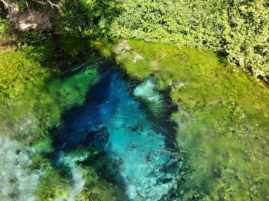 Источник очень глубокий – из-за большого напора воды на глубине пока никто точно не измерял, сколько там метров. У нас есть дрон, так что мы полетали над самым Глазом и с радостью делимся фотографиями.