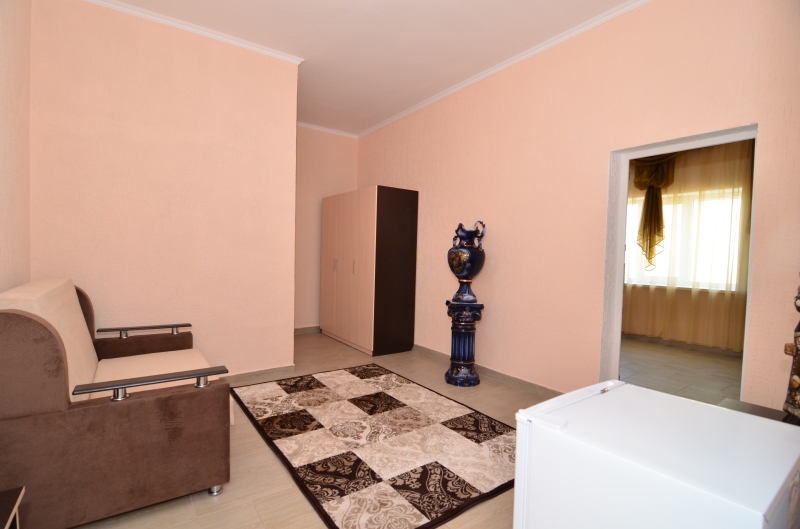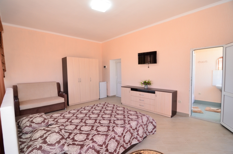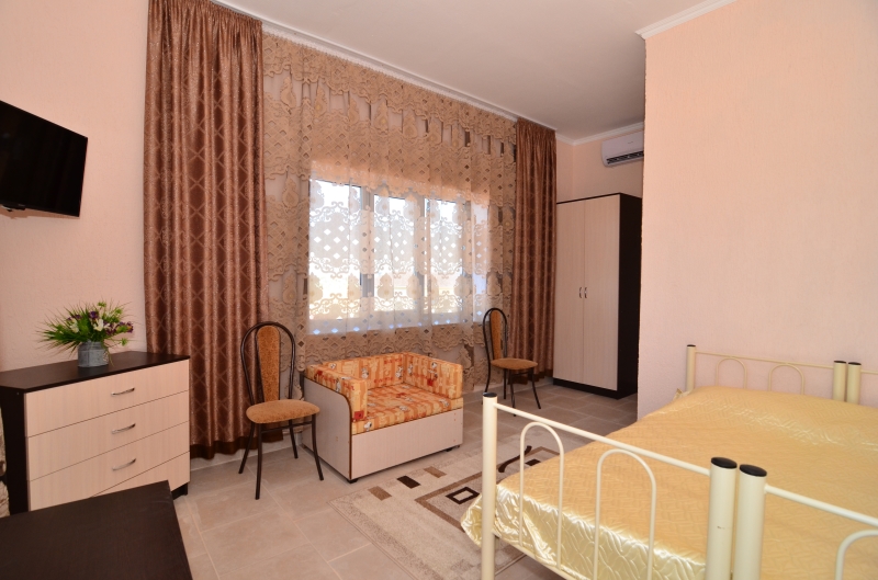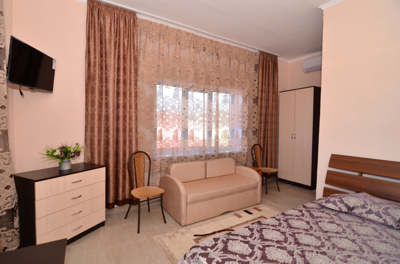 В номере: двуспальные кровати, диван, шкаф, стулья, прикроватные тумбочки, стол, комод, вешалка, зеркало, санузел, кондиционер, холодильник, телевизор, Wi-Fi, балкон с видом на море.