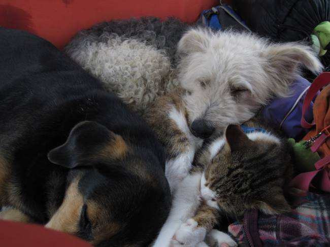 Это мы с мужем, моя подруга Ирина и весь наш зоопарк: две собаки и кот. Собаки, Лада и Рома, - бывалые путешественники, они были с нами в нашем большом автопутешествии на Урал, а вот Марсик - новичок.