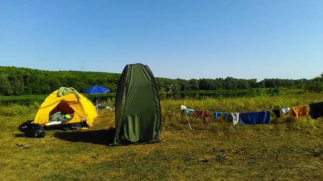 1) Разбивать лагерь в зоне с обильной растительностью. Собственно, этого вопроса я касался в предыдущей статье. Сделать это необходимо ещё на этапе подготовки к поездке. Думаю, зачем это делать объяснять не стоит: деревья сохраняют место от жары, прямого попадания солнечных лучей. К тому же, нашу стоянку со стороны просто не видно. Примером очень удачно выбранного места можно считать нашу стоянку на Ахтубе в 2018 году: мало того, что мы стояли в прибрежном лесу, так ещё и солнце на берегу светило до 12 часов дня, так как после полудня оно уходило за деревья за нашими спинами.