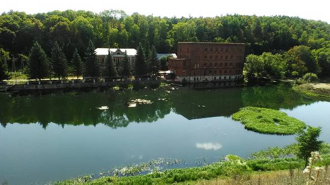 Дошли до плотины. За ней на правом берегу необычная мельница в виде дома.
