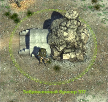 Еще один схрон расположен в левой нижней области карты возле поворота тропинки в кустиках. В нем лежат две консервы и 25 рублей.