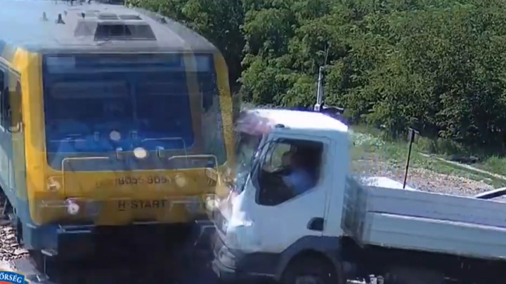 Венгерские полицейские опубликовали кадры аварии, произошедшей на железнодорожном переезде после того, как водитель грузовика выехал на рельсы, не обращая внимания на запрещающие сигналы.