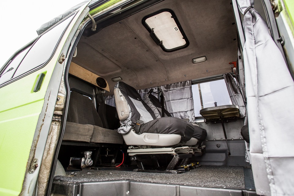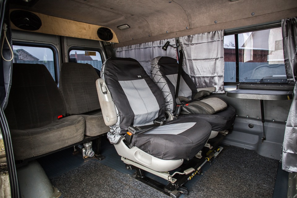 21. Частично сиденья уже заменены на правильные, но сзади пока еще остается штатный соболевский третий ряд. Со временем его место займет большой раскладывающийся диван.