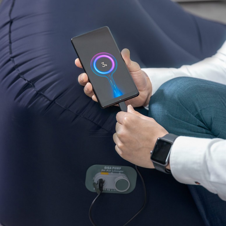 Очевидно, что для надувания матраса не потребуется никаких других устройств: достаточно нажать кнопку и встроенный насос сделает свою работу, приведя кровать в рабочее состояние менее чем за две минуты. В матрас также встроен аккумулятор от 2.600 мАч полная зарядка занимает около 4 часов; его также можно использовать для зарядки вашего смартфона.
