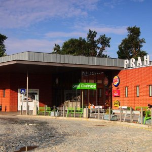 Удобно добираться автобусом из центра Праги и от главного ЖД вокзала, примерно 45 минут, 32 кроны, доехал в 2.30 ночи, совсем один. Обменник бесчеловечный при курсе 29 крон за евро дали 205 за 10 евро. Есть вай-фай, но зарядить телефон не получиться- нет usb разьемов и розеток во всем здании. Нашел одну на 2 этаже терминала 1, где зал для конференций. Туалетов навалом и до и после границы.