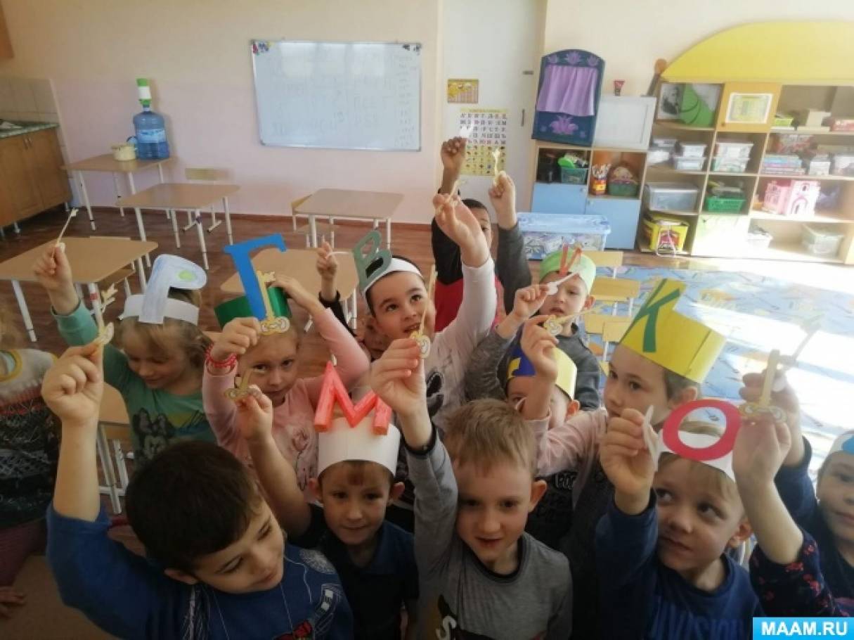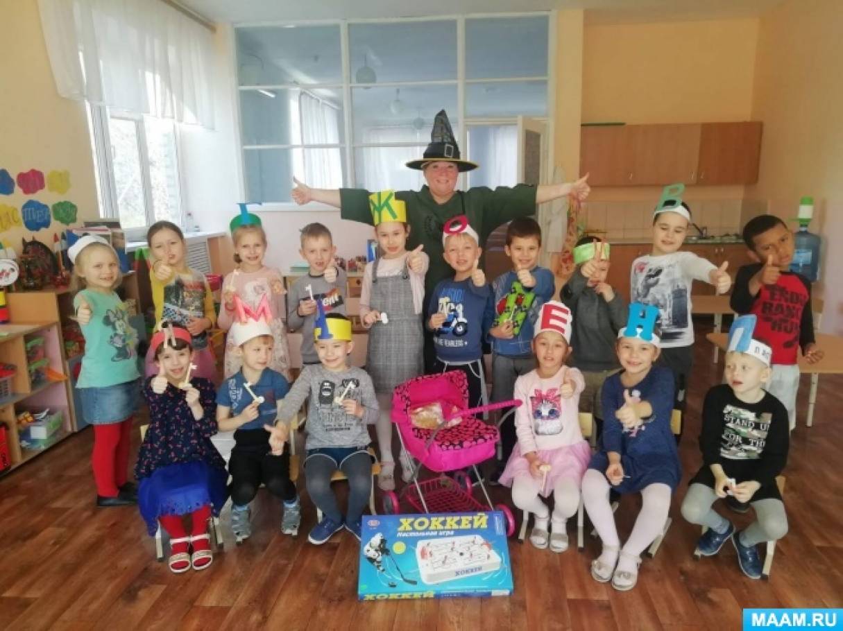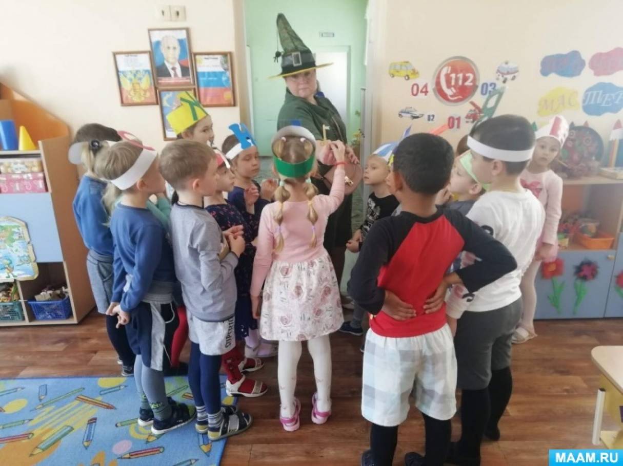 Педагог: Ребята, наши друзья Ежик, Мудрая Сова и Лисенок путешествовали по сказочному городу. Как назывался этот город? А куда они шли? А вы хотели бы помочь им в этом путешествии? (дети ставят стулья в «поезд», надевают ободки-буквы на голову, педагог надевает фуражку машиниста)