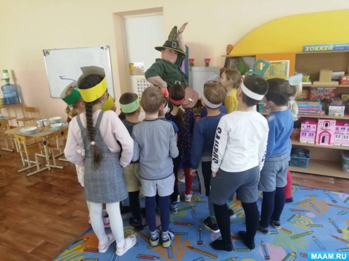 Педагог: Первая станция Гласные звуки. Приехали. Что это? Ой, ребята, кто-то потерял шляпу! Интересно, чья она? (педагог надевает шляпу).