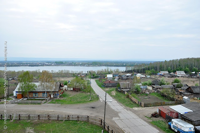 По плитам доезжаем до Енисея и налево- здесь до озер метров двести. На реке обычно кто-то пасется, то кони, то коровы. А на том берегу. незабудки цветут)))) какое-то приличное поселение с современными новенькими коттеджами