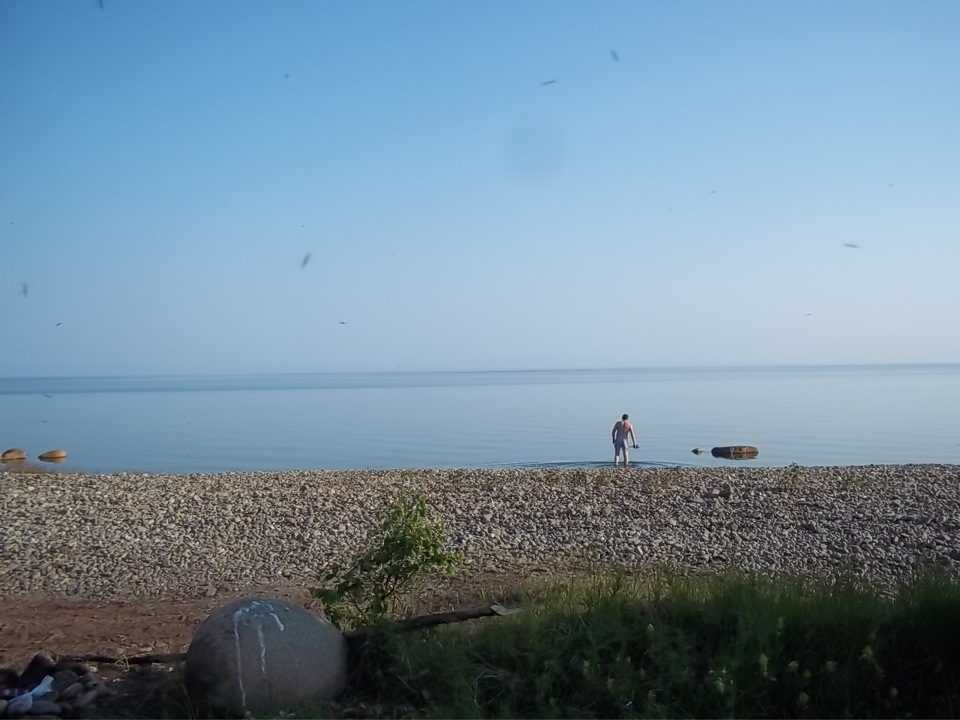 Берег был просто великолепен! Широкий, песчаный, красивый, с великолепными видами! Так как ветер дул с залива, то комаров практически не было, появлялись только в затишье, которое было ооочень редким.