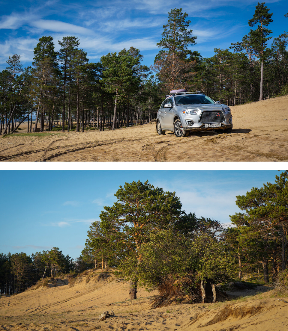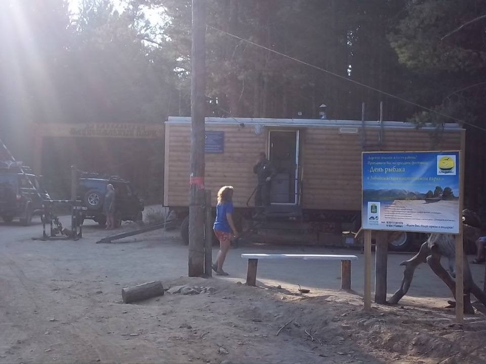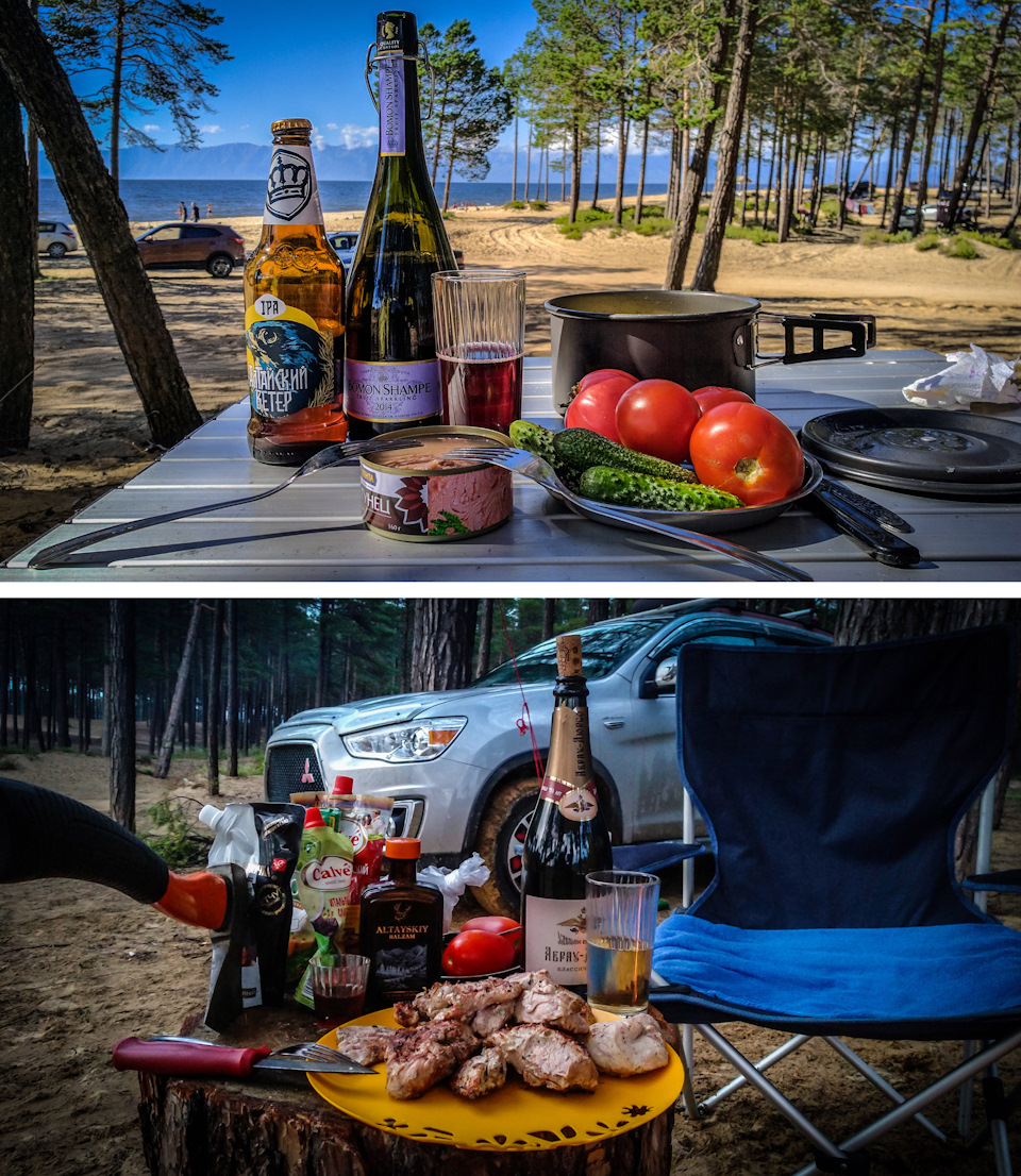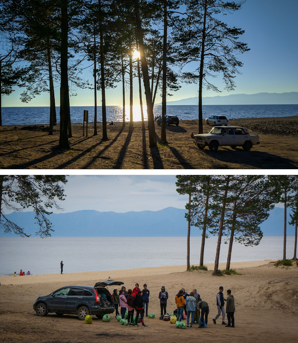 Через несколько км гравийки выехали к Байкалу. Слева от дороги небольшая полоса сосен, а за ней метров 20-30 ть песка и Байкал — Баргузинский залив. Так дорога идёт 20 км по перешейку и везде примерно одна картина, в лесочке перед Байкалом стоят добротные столы с лавочками и через некоторое расстояние друг от друга мусорные баки ну и везде палатки, шатры и туристы.