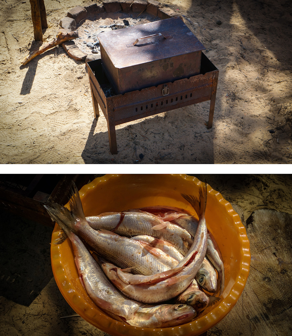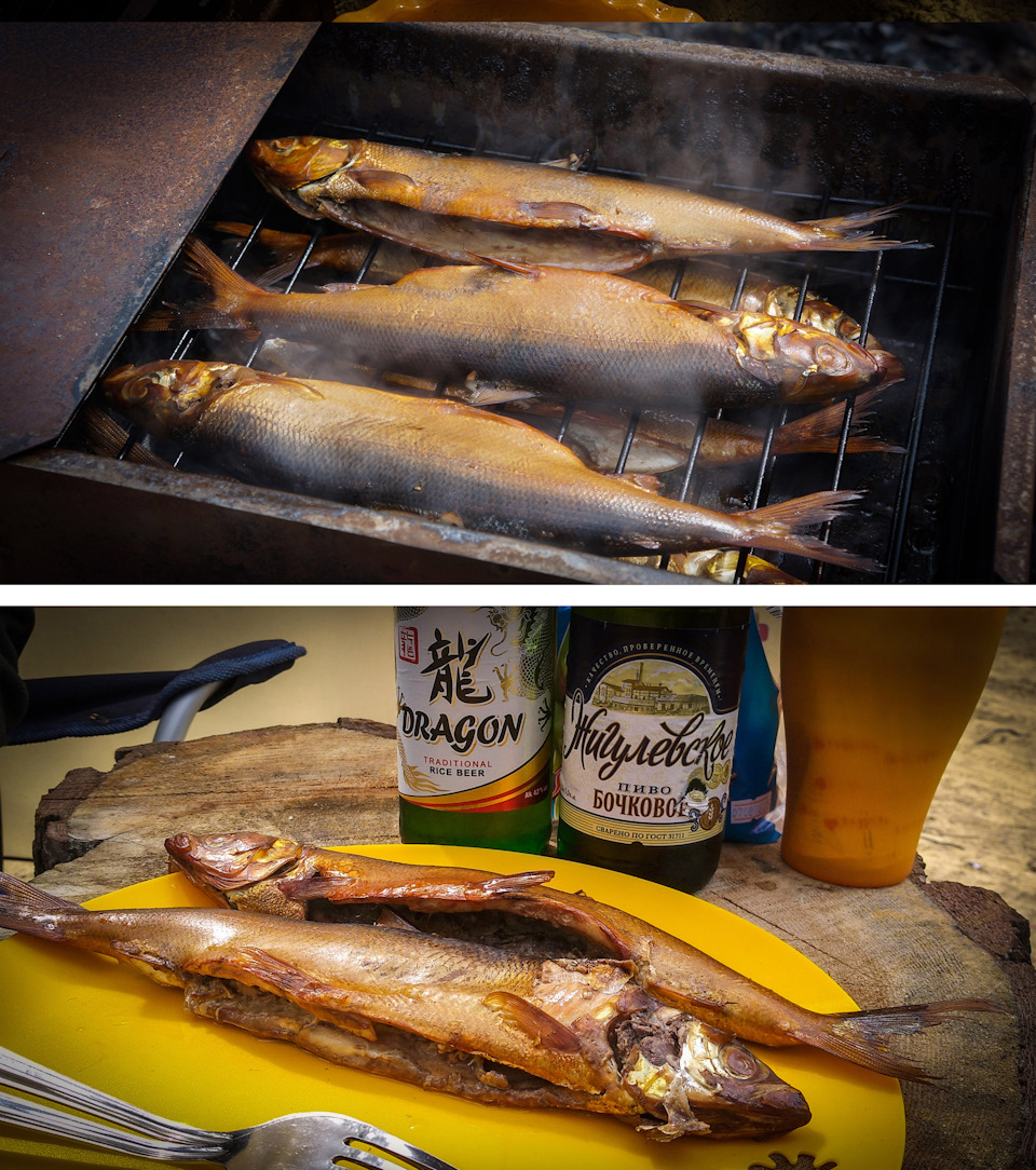 А рыбки то хочется… А с ней на этом побережье проблема – не продают даже, только пелядь. Благо в магазинчике, где мы затарились одежкой (об этом ниже), мне подсказали где можно купить омуля… Еще нетрезвый мужичок ходил по берегу предлагал, но как выяснилось – его он и предлагал. Копченный омуль был не дешев! За четыре небольших мы отдали 600 рублей, да он у нас по такой цене! Вкусный конечно, понаслаждались с пивком, но на следующий день, поехав в деревню «поработать», я затарился уже свежим – 450 руб. за полтора килограмма. А уж коптильня и опилки у нас в путешествиях всегда с собой!
