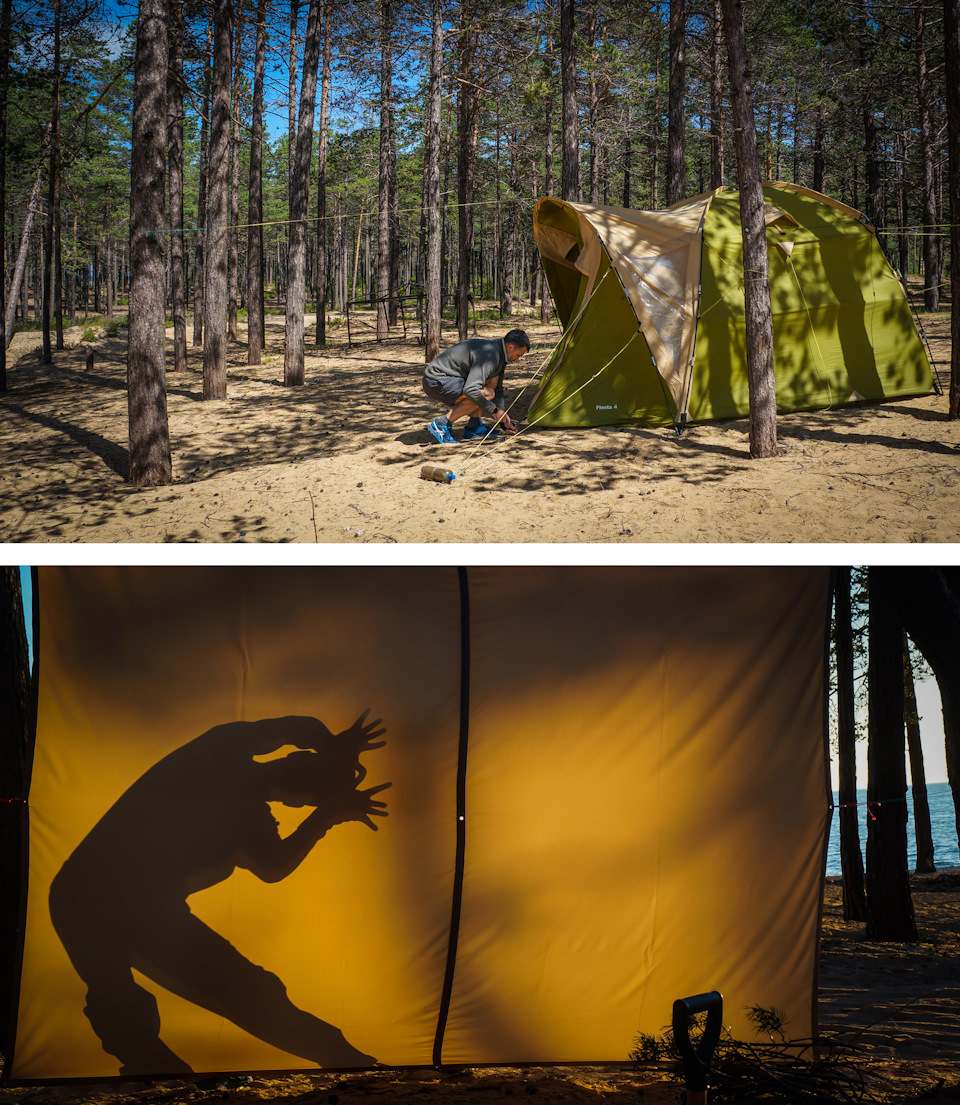 Спустил шины до единичек и малость прокатились по берегу… Место нашли очень классное, но на берегу была закопана мертвая нерпа ((( Запах был конечно очень нехорош и распространялся далеко, жаль, пришлось вернуться на ранее присмотренное местечко. Была суббота, обеденное время, светило солнце, народа не было, покой и тишина! Хорошее место! Там и начали разбивать лагерь… Кто же знал, что тусняк тут в основном по вечерам ((( Не скажу что меня это особо напрягало (как ни странно), но молодежь тут шныряет до полуночи туда-сюда, орет музыка из машин, но в целом ведут себя адекватно – вежливые, доброжелательные, не задиристые. К тому времени, как мы поняли, что место не идеально с точки зрения покоя, мы уже поставили и палатку и шатер и туалет, натянули маркизу, натаскали дров… Так что менять место дислокации было уже проблематично.