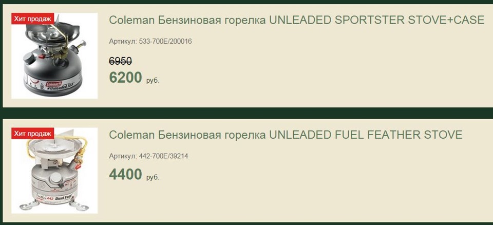 1) Coleman, американские (пишут они высокого качества, как "иномарка", если у кого есть — отпишитесь :) ). Достаточно дорогие (от 5000 руб), пишут, что от плохого бензина может засорится трубка парогенератора, и ее придется менять (
