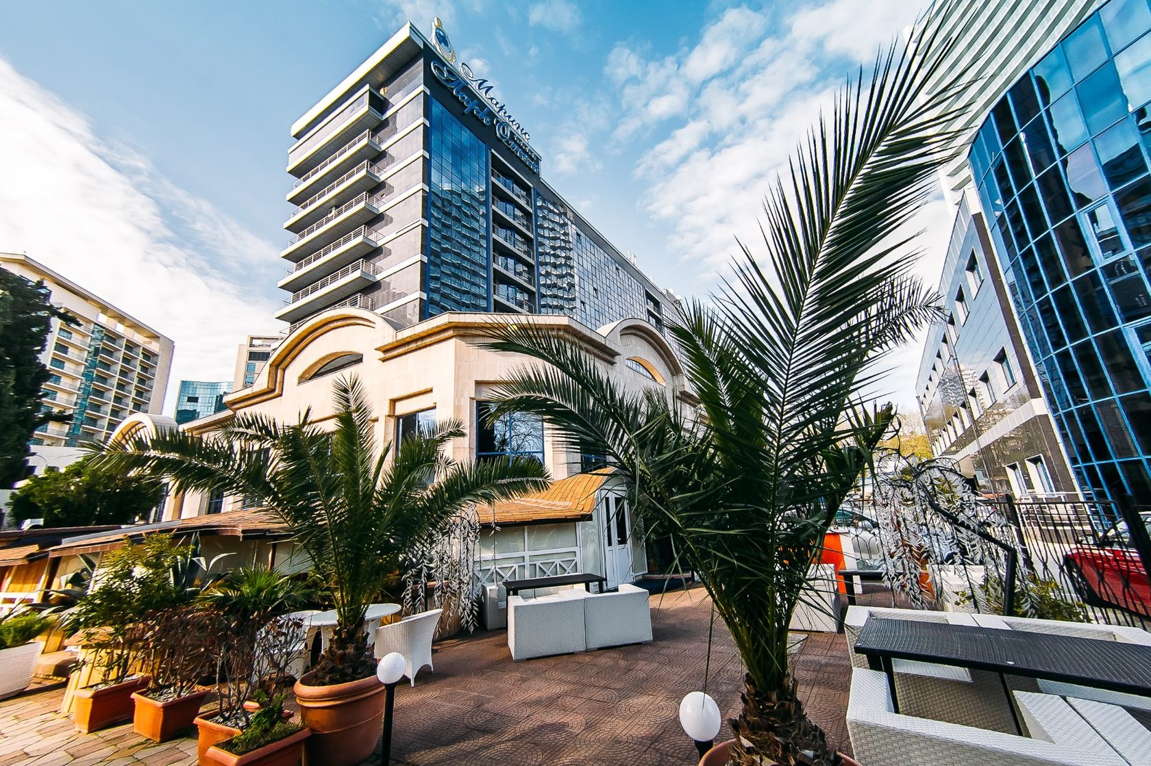 Пятизвездочный гостиничный комплекс Pullman & Mercure - идеальное решение для бизнес-отдыха. Здесь уже и море ближе (необходимо только спуститься вниз по лестнице с территории отеля, пересечь общественную зону — и вы на собственном пляже), и виды на него тоже присутствуют. На территории комплекса располагается ресторан средиземноморской кухни, арт-бар и собственный бизнес-центр. Если по какой-то причине вам не захочется ужинать в ресторане при отеле — не беда. Вы находитесь в самой красивой части центра Сочи, где расположено большое количество кафе и баров на любой вкус. И опять-таки плюс отеля плавно перетекает в его минус.