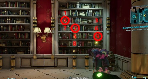 Теперь идите к книжному шкафу справа от стола. На ней вы увидите цифры. Взаимодействуйте с нужными книгами, чтобы открыть секретный проход в помещение с массой ценных вещей.