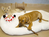 Парочка закадычных друзей – 11-недельний африканский львенок по кличке Коза и трехмесячный щенок итальянского мастиффа Каира, весело проводят время, бегая наперегонки по зоопарку калифорнийского города Сан-Диего.