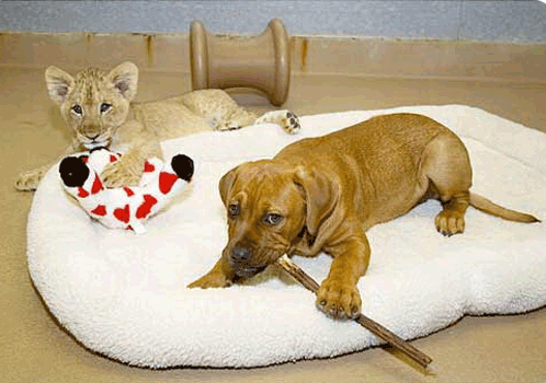 Так прожили лев и собачка целый год в одной клетке.