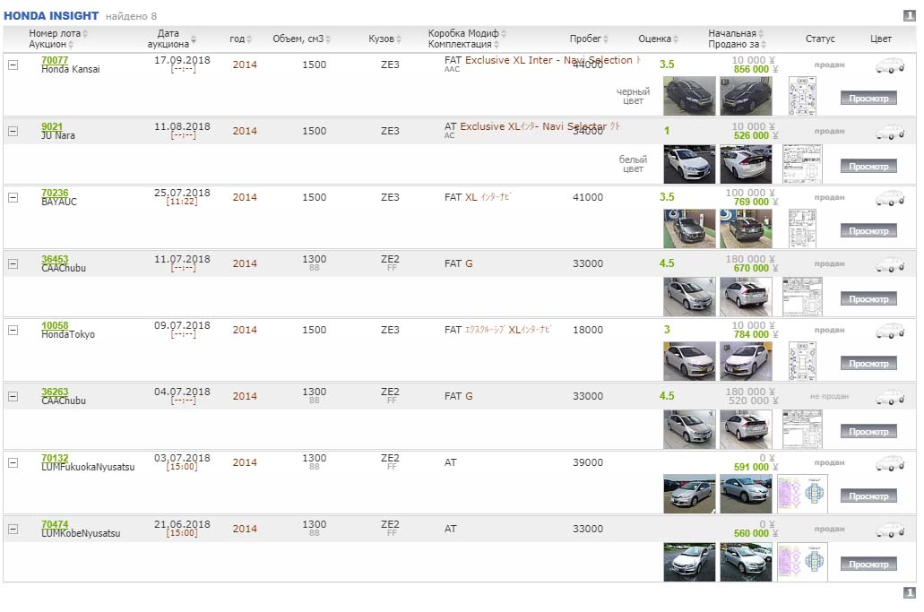 Японский концерн Honda прекратил выпуск семейного хэтчбека Insight в 2014 году. По этой причине «свежих» Инсайтов 2014 года продается на аукционе немного. Их средняя цена составляет примерно 700 тыс.руб.