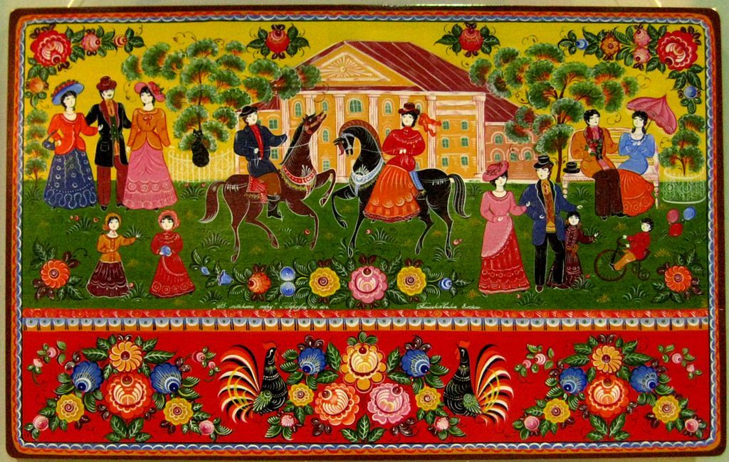 Городецкая роспись. История неповторимой сюжетной городецкой росписи насчитывает уже более полутора веков. Самые распространенные сюжеты – гулянья, чаепития, народные праздники и, конечно, знаменитый городецкий конь с всадником. Богатство красок, гирлянды цветов и причудливые птицы – городецкая роспись словно переносит на цветущий, залитый солнцем луг.