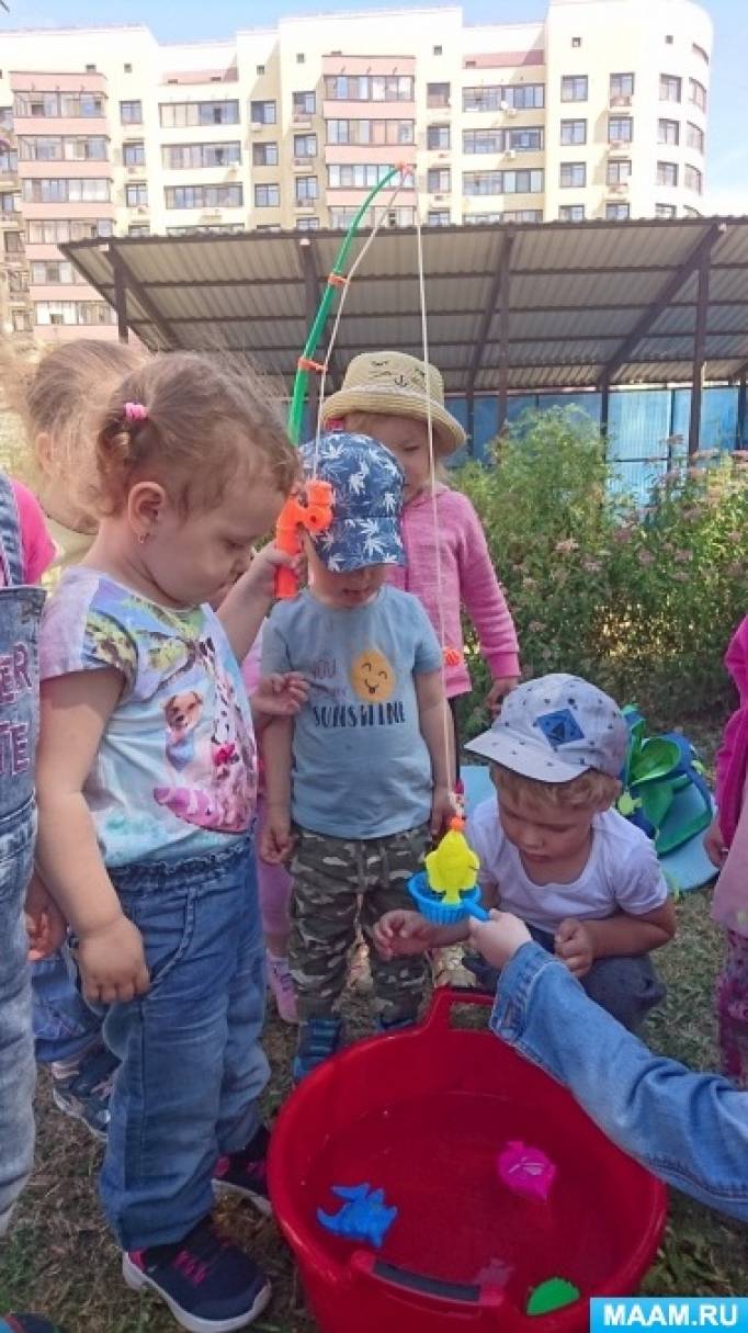 Задание: Дети делятся на две команды. Участник ловит одну рыбку, бросает ее в ведро и возвращается к команде. Выигрывает команда, поймавшая большее количество рыбы.