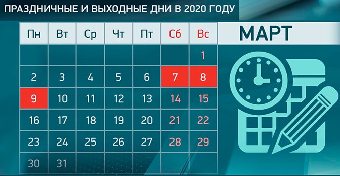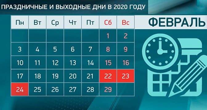 Таким образом, в 2020 году будет восьмидневный отдых с 1 по 8 января, трёхдневный отдых с 22 по 24 февраля, совпадающий с празднованием Дня защитника Отечества, трёхдневный отдых с 7 по 9 марта, совпадающий с празднованием Международного женского дня, пятидневный отдых с 1 по 5 мая, совпадающий с Праздником Весны и Труда, трёхдневный отдых с 9 по 11 мая, совпадающий с празднованием Дня Победы, трёхдневный отдых с 12 по 14 июня, совпадающий с Днём России, 4 ноября – День народного единства.