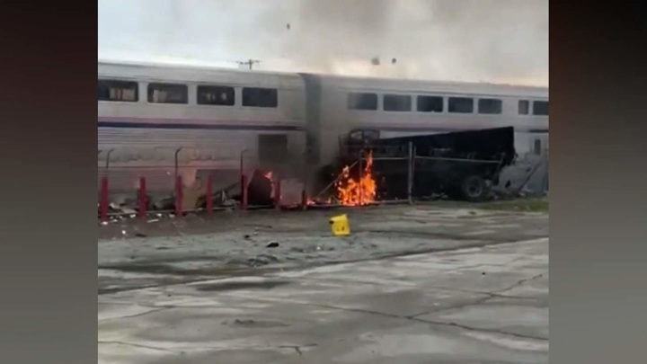 Следовавший из Сиэтла в Лос-Анджелес скоростной поезд врезался в застрявший на переезде грузовик в калифорнийском Окленде, сообщает ABC7. Момент столкновения сняли на видео очевидцы.