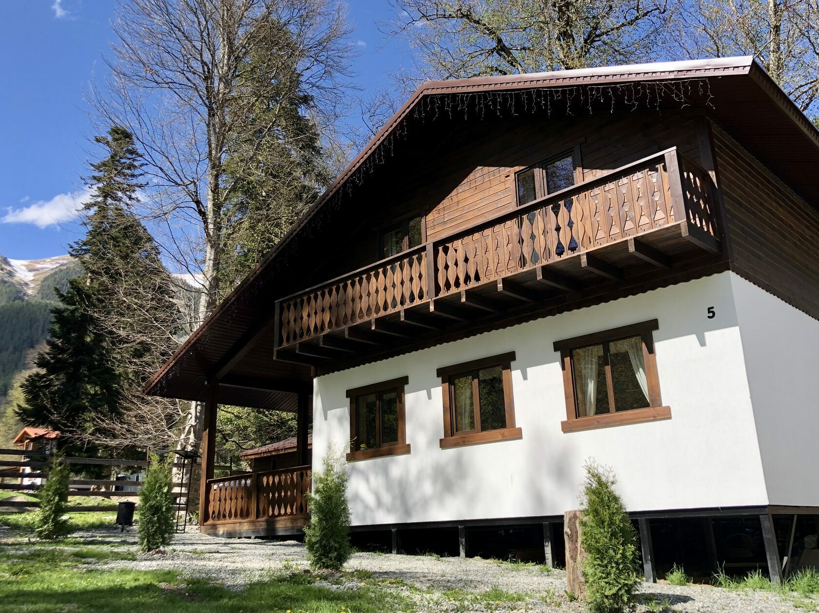 Обустроенная территория с зонами для барбекю и отдыха, уютные колоритные домики из натурального сруба, бани и сауны на территории, детские игровые площадки, кухни со всем необходимым оборудованием для приготовления еды — все это малая часть услуг, которые предоставляются гостям в шале Архыза.
