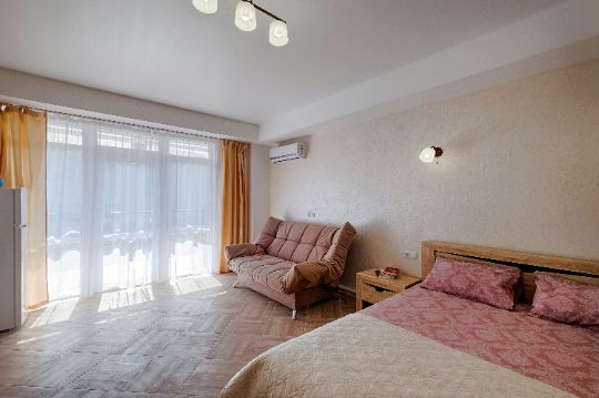 1-комнатный номер, предназначен для 2х отдыхающих с возможностью организации дополнительного спального места. В номере есть двуспальная кровать, стол и стулья, шкаф для одежды, холодильник, кондиционер, бесплатный Wi-Fi, телевизор со спутниковым ТВ, прикроватные тумбочки. Санузел состоит из унитаза, умывальника, душа.